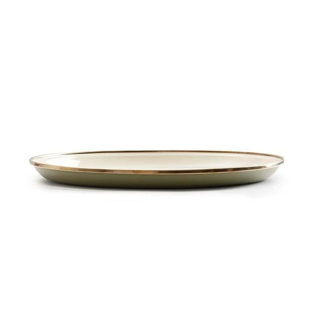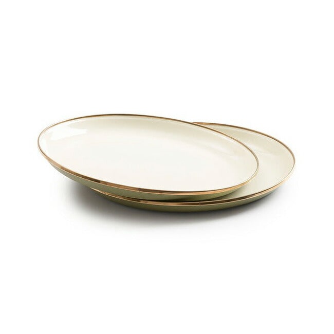 ※エナメルウェアのリムは熱処理され、ブロンズのような緑青仕上げが施されています。プレートの表面と縁は、レモンなどの酸性の食品や、強力な洗剤やクレンザーによって、その独特の色が剥がれてしまうことがあります。