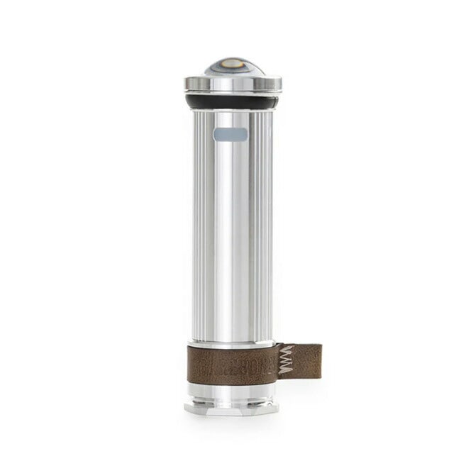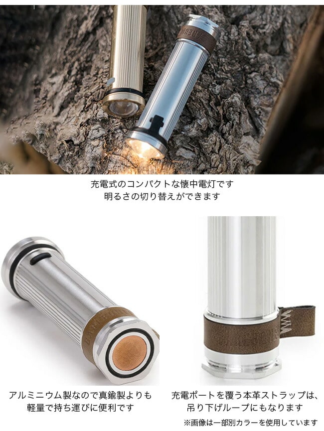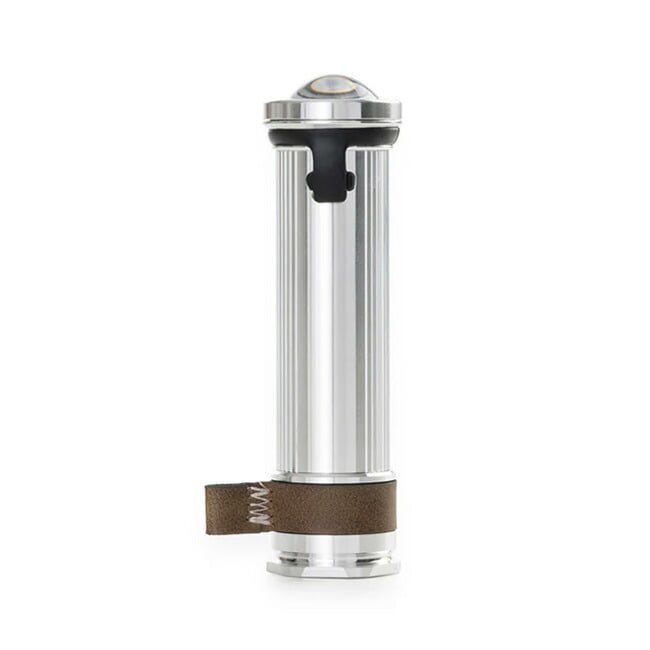 明るさの切り替えができ、コンパクトなサイズ感で持ち運びにも便利なので、あらゆるシーンで活躍します。湾曲したドームレンズはヴィンテージな雰囲気を漂わせ、充電ポートを覆う本革ストラップは、吊り下げループとしても機能します。
