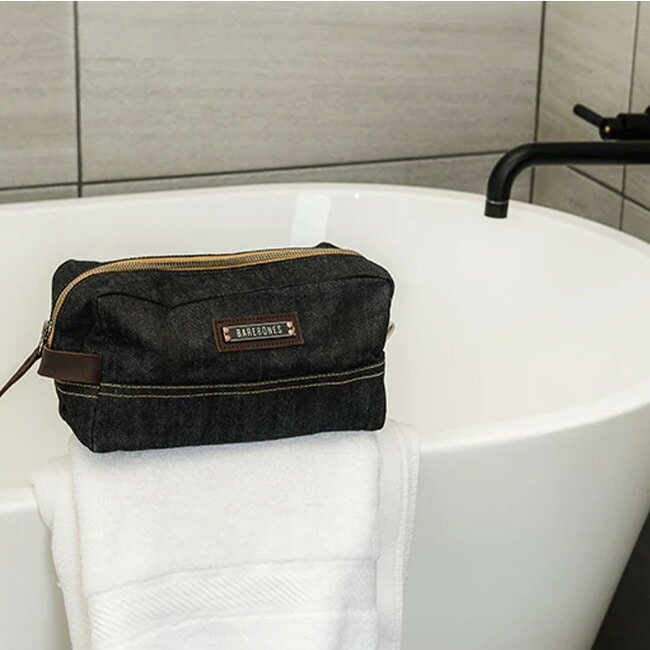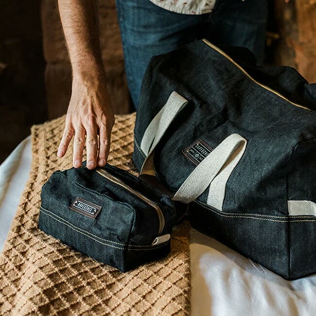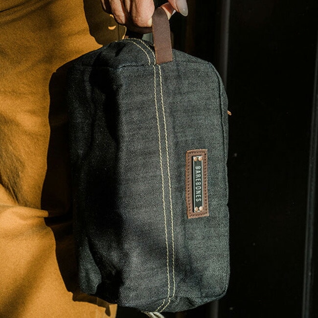 深みのある豊かなブルーのワックスコーティングを施した丈夫なデニム生地を使用し、ジッパークローザーが収納した荷物を守ります。このオーガナイザーは、無駄なものを一切排除し、パッキングして持ち運べるように作られています。