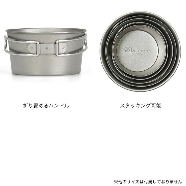ハンドルが折り畳めるので入れ子でもスタッキング可能です。食器はもちろん、調理にも使える250mlから850mlまでの5サイズ(BM-425~BM-428.BM-339)がきれいに収まります。
