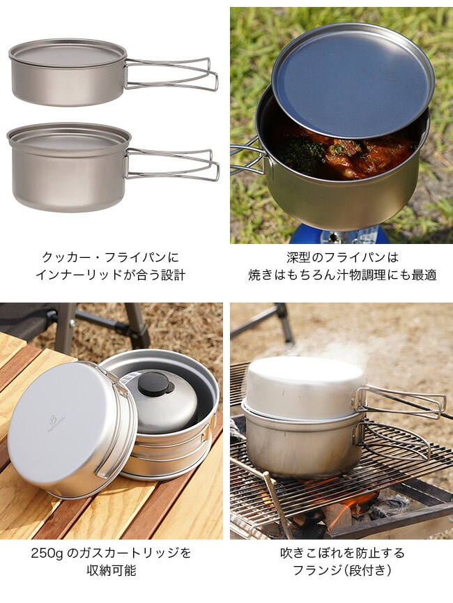 クッカーは吹きこぼれにくい段付き構造で、インナーリッドを使えばフライパン調理も同時に行えます。深型のフライパンは焼きはもちろん、汁物調理にも◎。