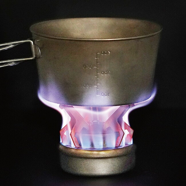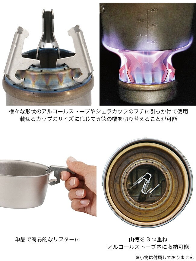 様々な形状のアルコールストーブやシェラカップのフチに引っかけて使用し、載せるカップのサイズに応じて五徳の幅を切り替えることができます。単品で簡易的なリフターとして使用することも可能です。