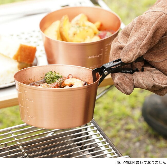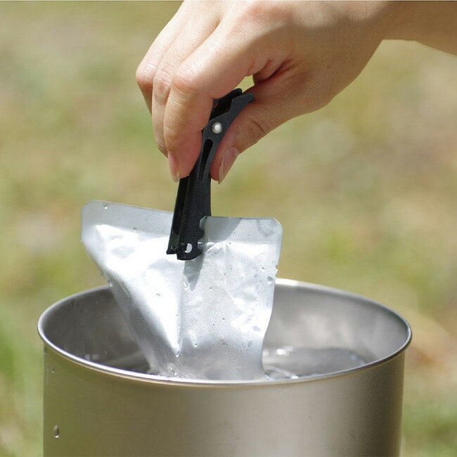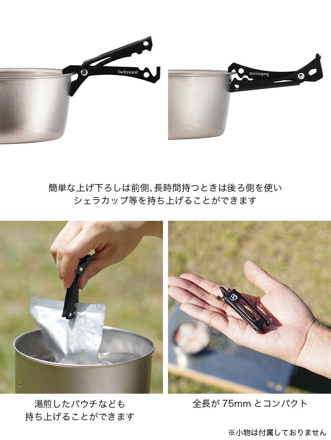 簡単な上げ下ろしは前側、長時間持つときは後ろ側を使い、湯煎したパウチなども持ち上げることができます。全長が75mmとコンパクトでシェラやマグとのスタッキング性の高いサイズです。