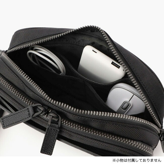 PC周辺アイテムやガジェット、貴重品など必要なものだけをコンパクトに整理して持ち運びできる設計です。ワントーンでまとめることで異素材のコントラストが際立ち、ビジネスにもトラベルにも馴染む洗練された印象に仕上げました。