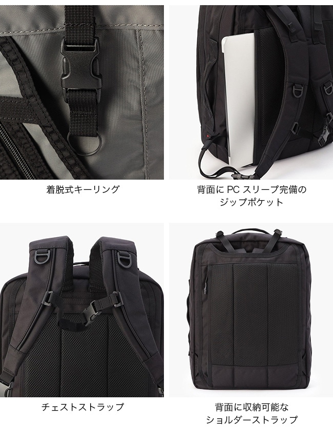 PCやその他電子機器の収納に便利なポケットを完備することで、ビジネス、出張、旅行と幅広いシーンで活躍大容量バックパックです。パーツごとに異なる2種類の素材を使い分けることで、耐久性と機能性を両立しています。