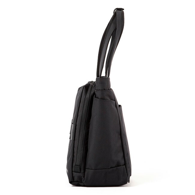 両サイドには折りたたみ傘やドリンクボトルを収納できるアウトポケット、背面にはオープンポケットを内蔵したファスナーポケットを備えています。