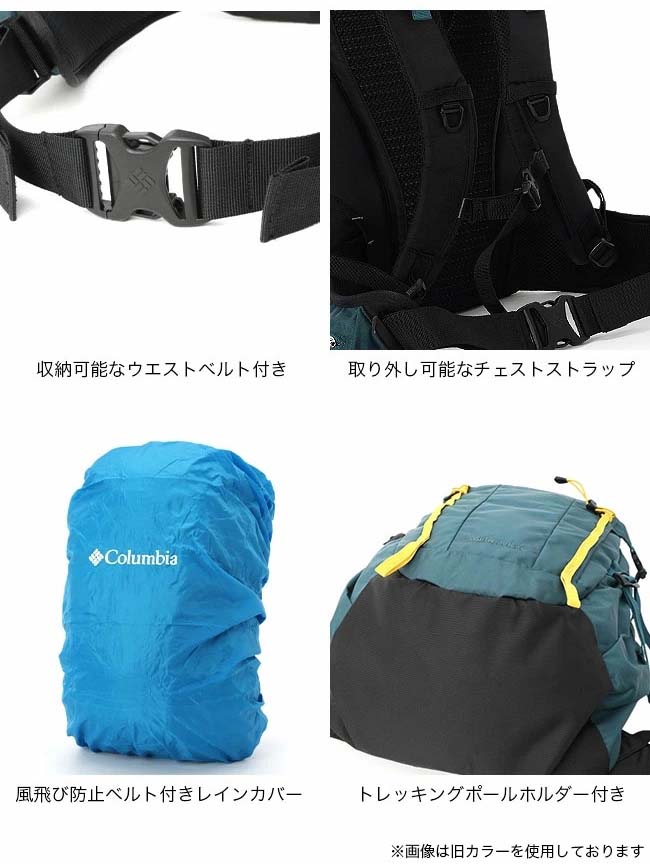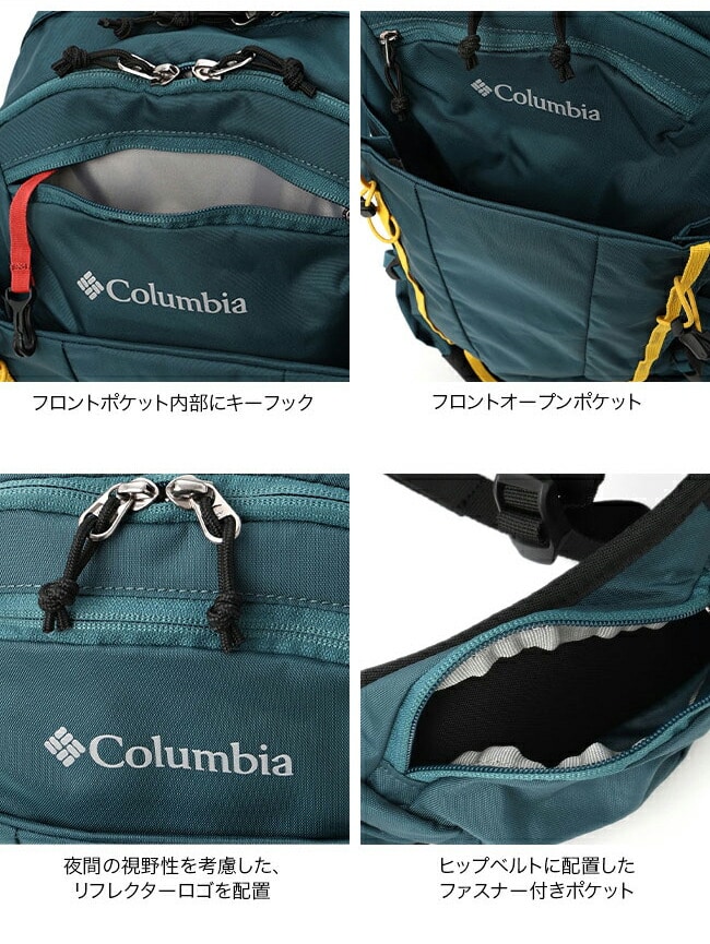 コロンビア独自のはっ水(撥水)機能「オムニシールド」を搭載、強度の高い420デニールのナイロン素材を使用し、メインコンパートメントの開口部は大きく開く、パネルローディング仕様で収納物の確認やアクセスが簡単です。メインコンパートメント内部にオープンポケットを配置、フロントポケット内部にキーフック。