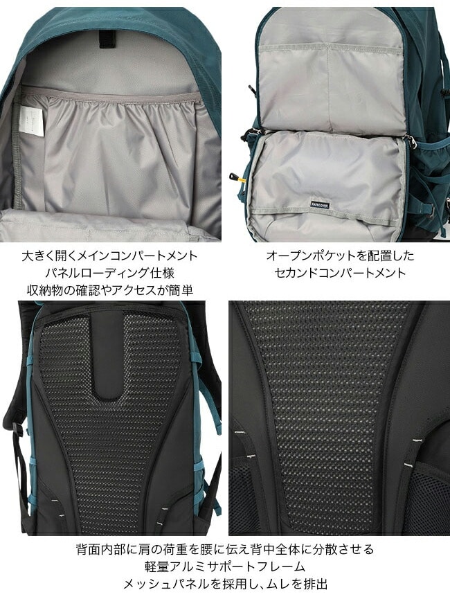 ・背面内部に肩の荷重を腰に伝え背中全体に分散させる軽量アルミサポートフレーム