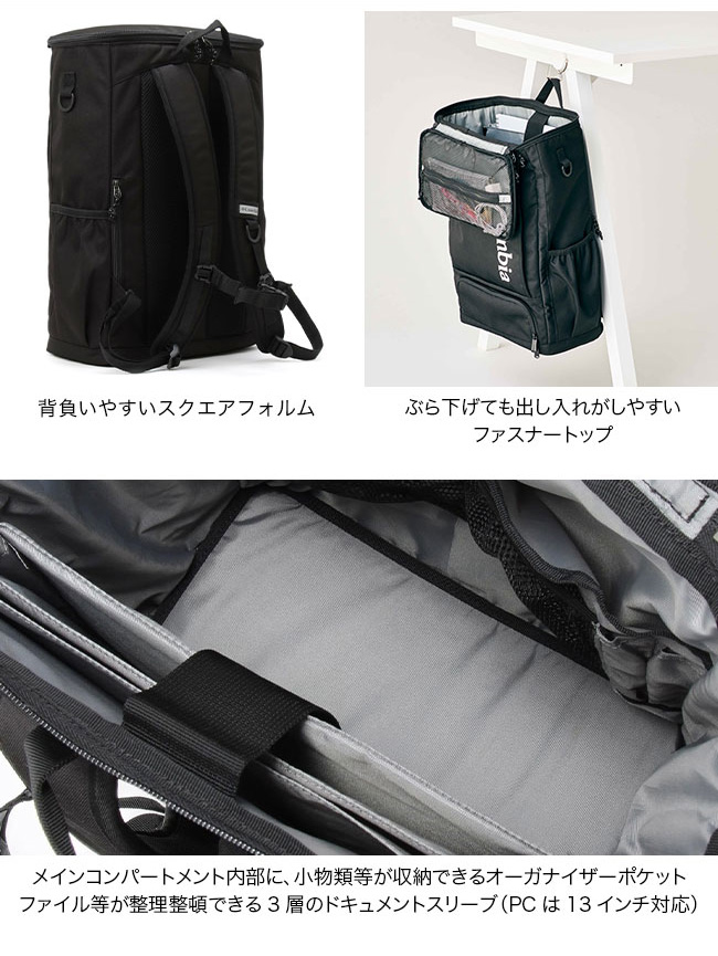 背負いやすいスクエアフォルムの本体には、13インチまでのPCやファイルが整理できる3層のドキュメントスリーブや、オーガナイザーポケットを備えたメインコンパートメントを搭載。