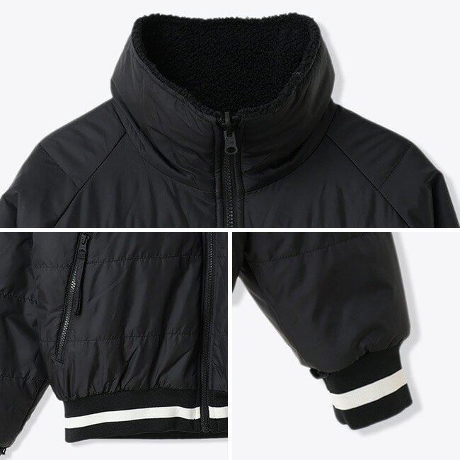 中綿入りのパファージャケットは、両面を異素材で仕立てたリバーシブルタイプ。