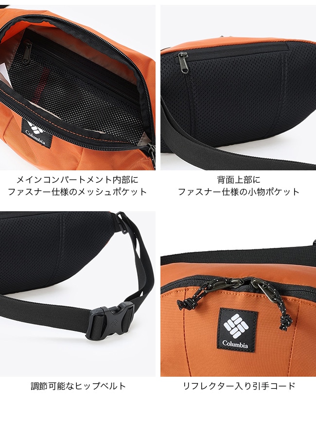 コロンビア独自の撥水機能「オムニシールド」を搭載した、アウトドアにも日常使いにも適した汎用性の高いヒップバッグ。コンパクトながらも、軽量で強度のバランスに優れた420デニールナイロン素材を使用し、容量は約2.5L。
