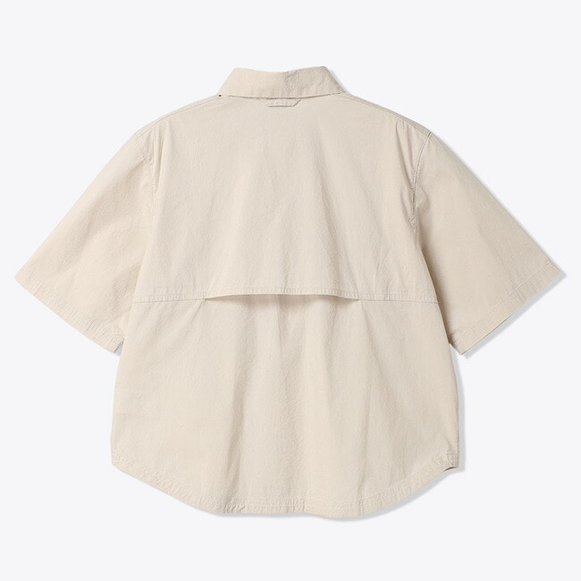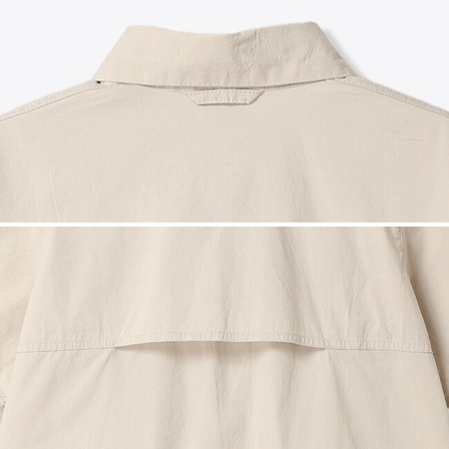 コンパクトな丈感とゆったりとしたボックスシルエットで、アウトドアにも日常にも取り入れやすいカジュアルなデザインに仕上げています。素材にはコットンとナイロンをベースにポリウレタンを混紡したミッドウェイトプレーンウィーブ生地を採用し、軽やかさと程よいハリ感、ストレッチ性を兼ね備えた快適な着用感を実現。