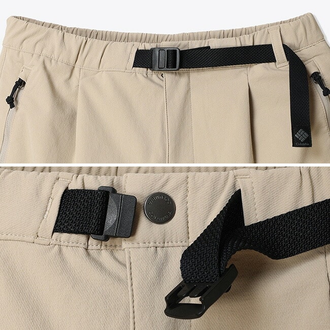 ウエストは片手で調整できるナイロンベルト仕様に加え、ベルトループも備えた実用的な設計。