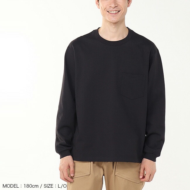 ゆったりしたオーバーサイズシルエットのポケット付きロングスリーブTシャツ。左胸にポケット、左サイドにはピスネームを配置。