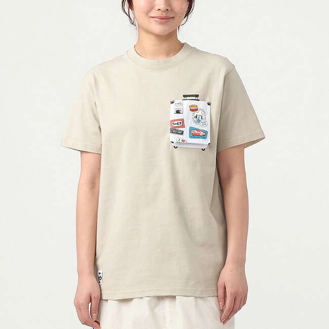 フロントの胸ポケットはキャリーケースをモチーフに、旅気分を高めるステッカーデザインをプラス。