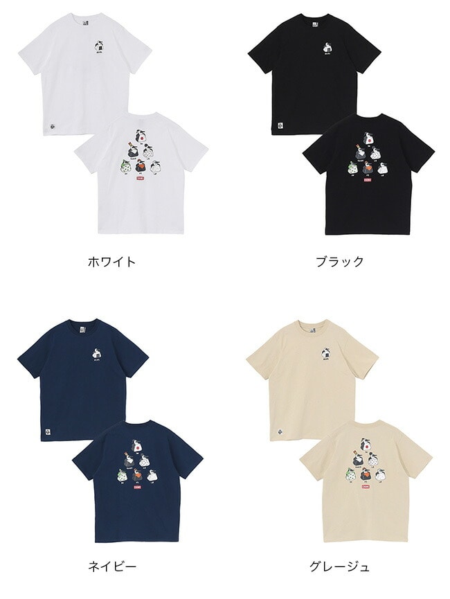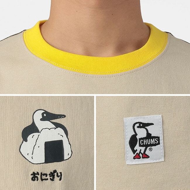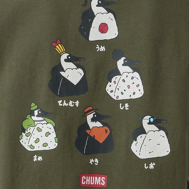 ブービーフレンズそれぞれのカラーや個性を“おにぎりの具”で表現した、CHUMSらしいあそびゴコロあふれる一枚です。フロントにはワンポイント、背面にはおにぎりの形にレイアウトしたブービーフレンズを大胆にプリント。