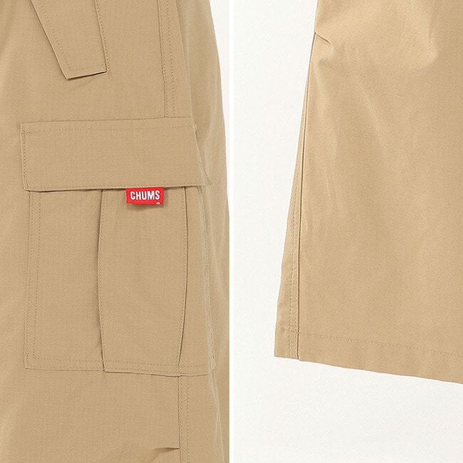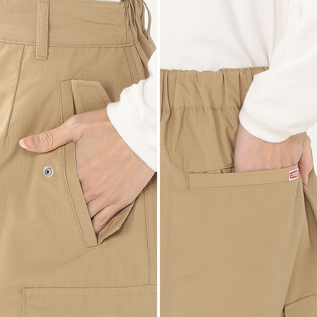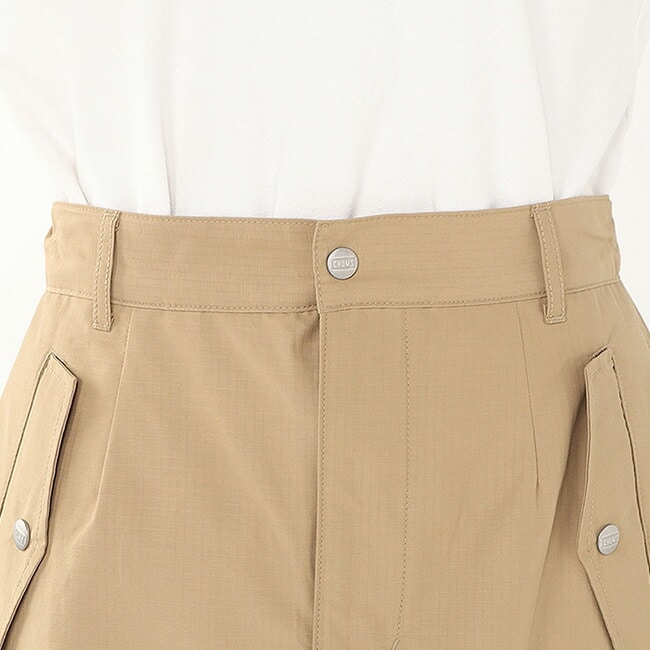 両サイドのフラップポケットや、膝に入れたタックが程よいミリタリー感をプラス。