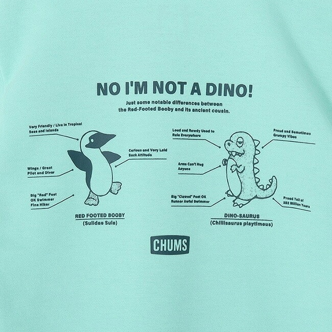 バックプリントでは、「NO I'M NOT A DINO!(ちがうよ、恐竜じゃないよ)」の言葉とともに、ブービーと恐竜を比べた“比較図解”をユーモラスに表現。