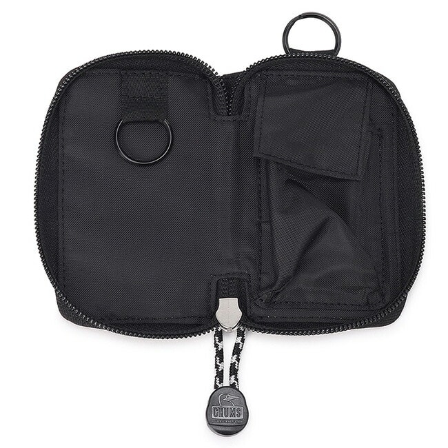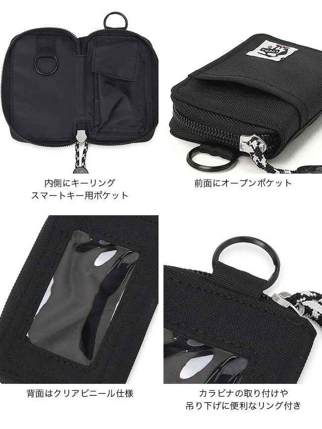 本体はファスナー仕様で中身が飛び出しにくく、前面ポケットにはカードや駐車券を収納できます。