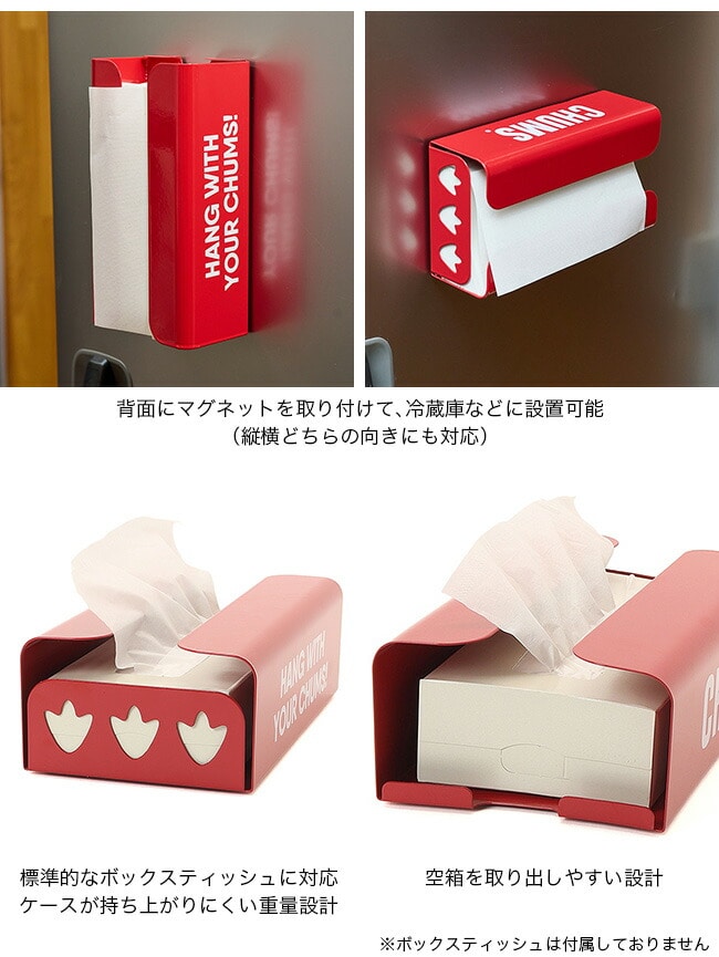 卓上で使用しても安定感があり、ティッシュを引き出す際にケースが持ち上がりにくいのが特長です。縦横どちらの向きでも設置でき、背面のマグネットで冷蔵庫に固定して使用することも可能。