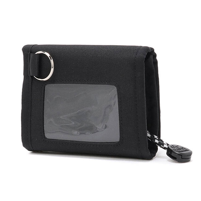 後面には透明セルのカードポケットとDカンを備え、吊り下げや携帯性にも配慮したデザインです。