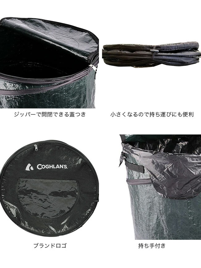 COGHLANS コフラン ポップアップキャンプトラッシュカンはキャンプサイトで興醒めするゴミ袋を隠してくれます。コンパクトに畳める便利なごみ箱ですが、RV車内の荷物整理や、子ども部屋のおもちゃ入れなど使い方はアイデア次第です。