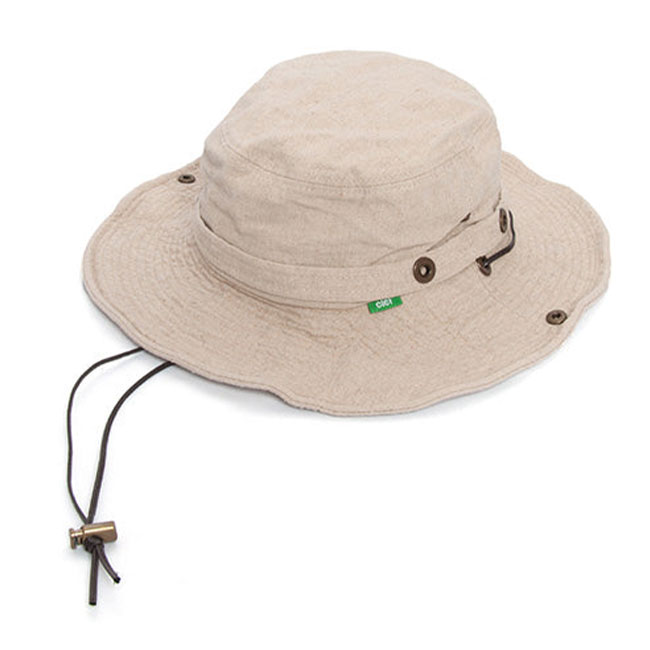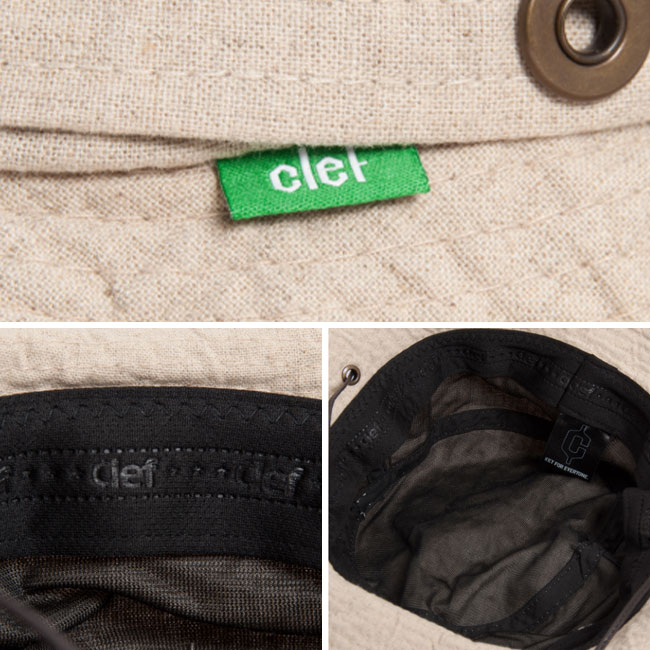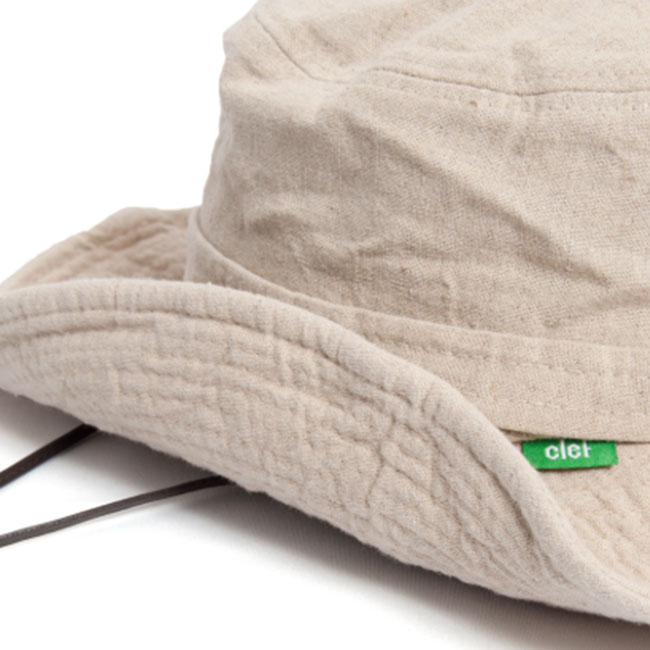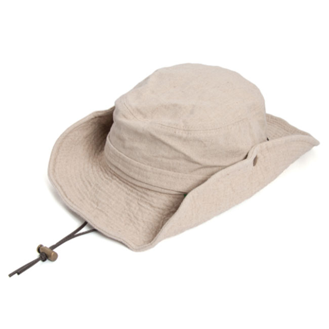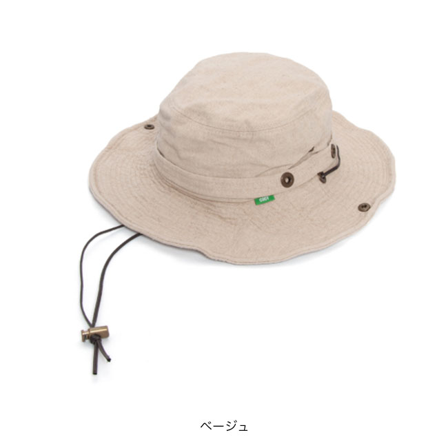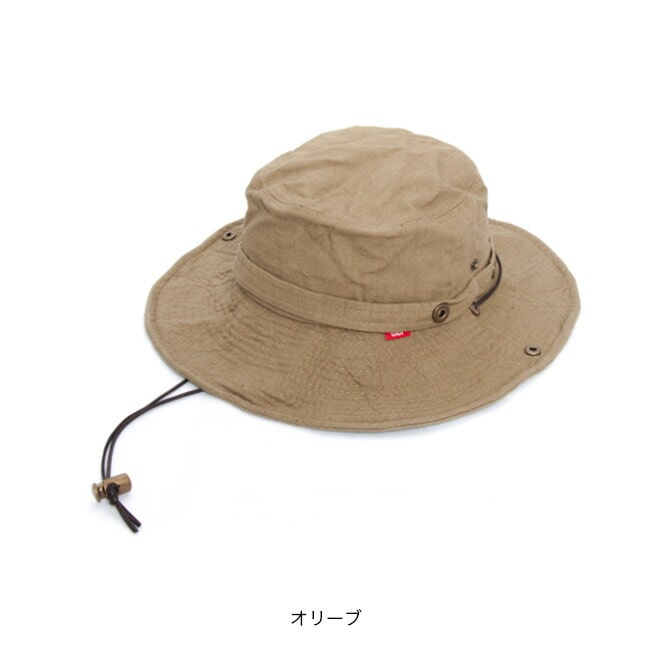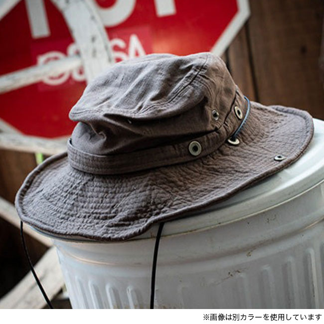 綿50%麻50%の生地に洗いをかけた生地感は写真で見るより上質で、 ツバにはワイヤーが入っていて、自在にスタイルを変える事ができます。ヒモ部分はストッパーが付き、汗止めにはオリジナルロゴ入りの 吸水速乾素材を使用しアウトドアシーンでも活躍すること間違いなしのアイテムです。