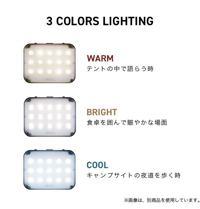 3つの光色はそれぞれ明るさも調節でき、例えば、テントの中で語らう時には「Warm」を好みの明るさに。