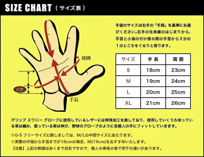 日本人の手にフィットするように裁断型も調整され、アメリカ産牛皮を輸入し作られたジャパンメイドの正規品グリップスワニーグローブです。