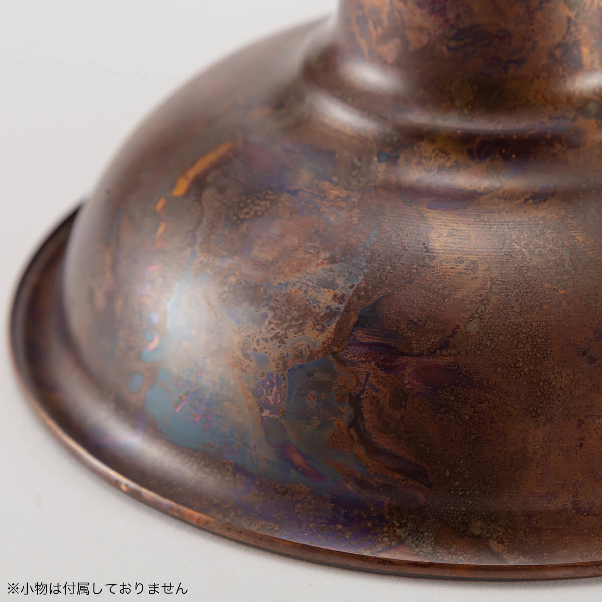 銅の腐食性を利用し伝統技法で薬品や炎をコントロールすることで、機械では表現できない独特な色彩を発色させている。