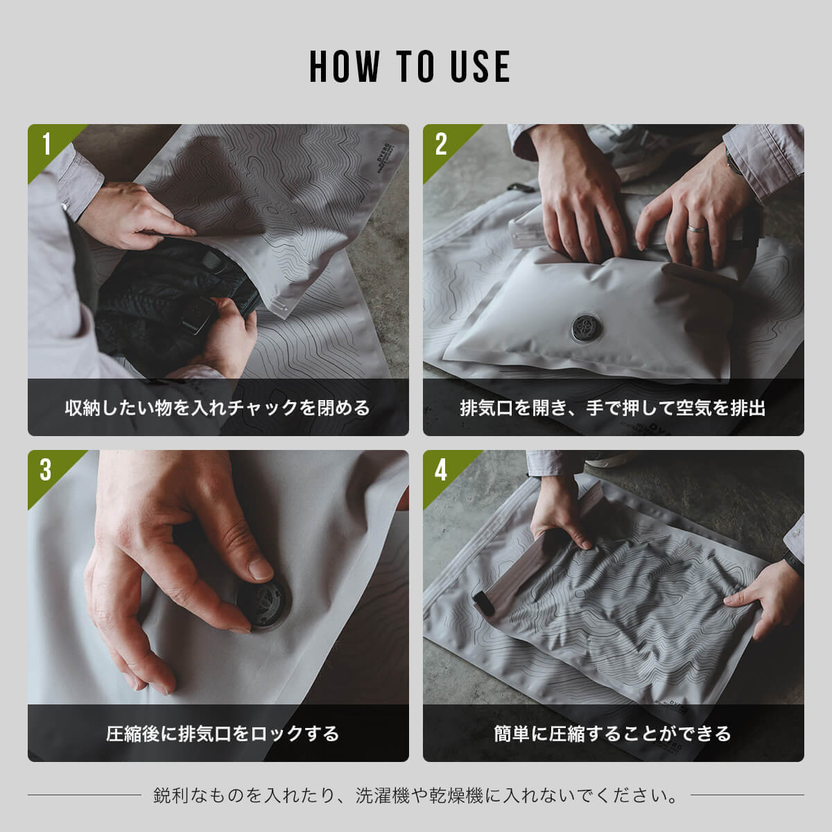 上部のスライダーで袋を密閉し、ロック式の排気口から空気を排出することで、簡単に圧縮することができます。