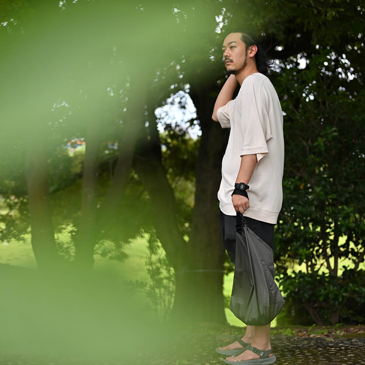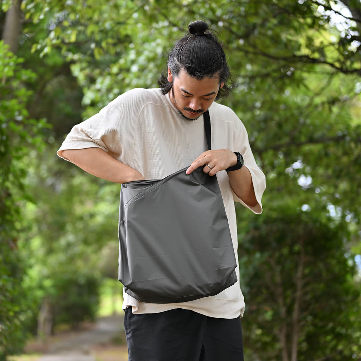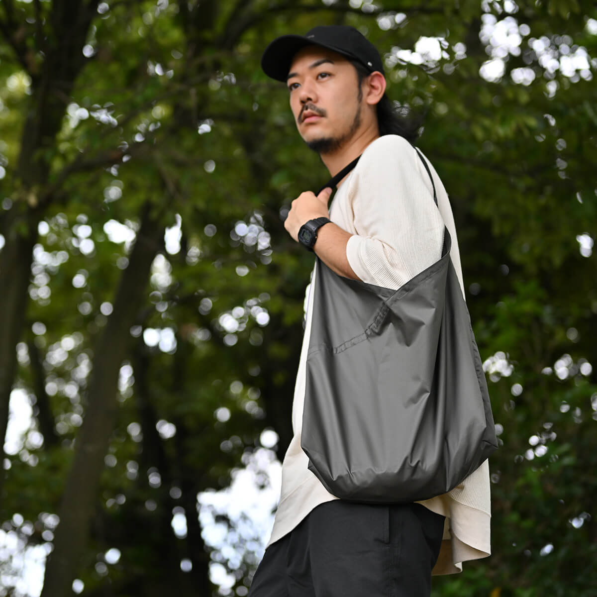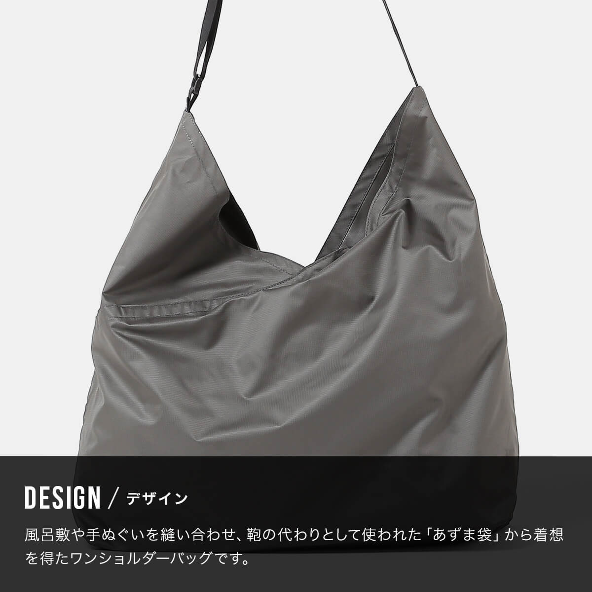 軽さとコンパクトに収納できる手軽さが特徴です。風呂敷や手ぬぐいを縫い合わせ、鞄の代わりとして使われた「あずま袋」から着想を得たワンショルダーバッグのMサイズです。