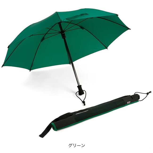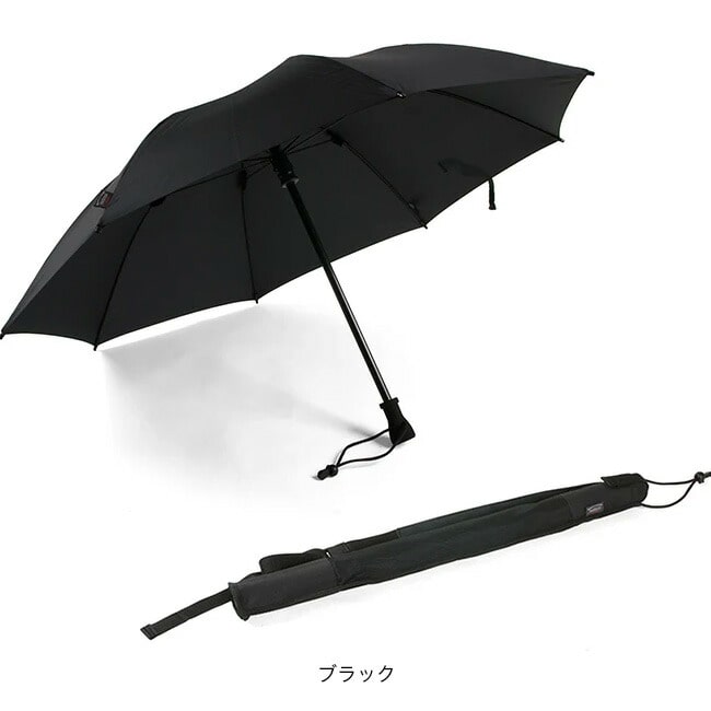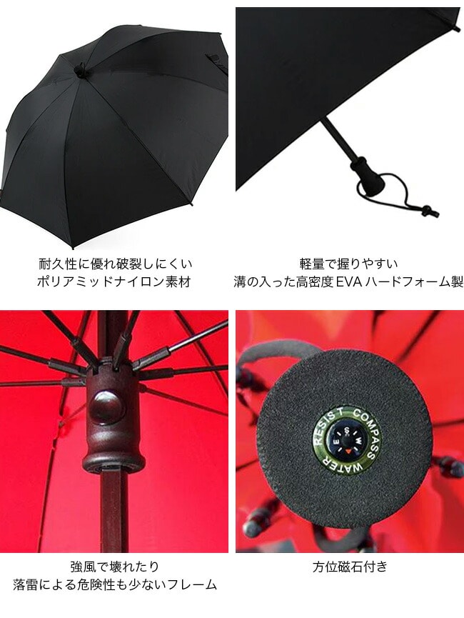 グローブを着用したままでも持ちやすく、突然の強風でも傘が飛ばされないようにエンド部にセーフティランナー付きで、野外で便利な方位磁石もグリップエンドに装着されています。