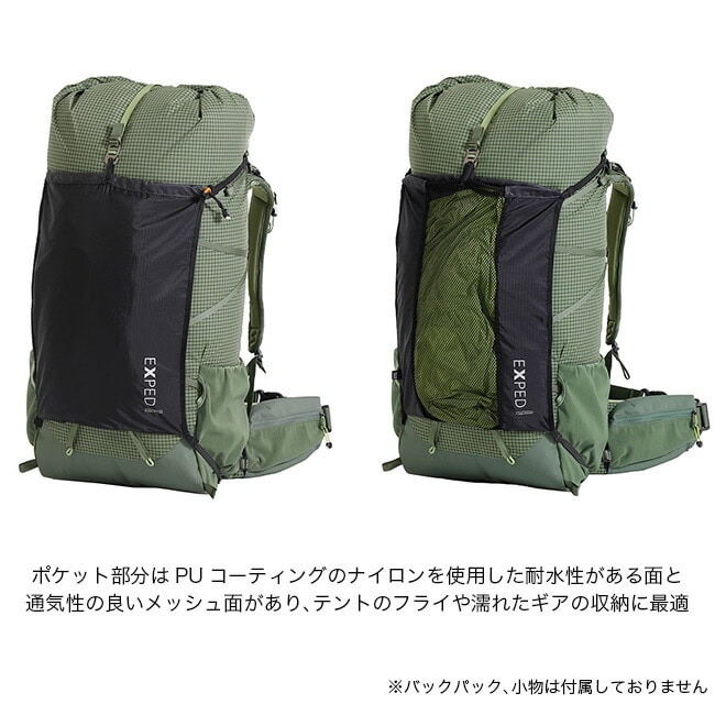 ポケット部分はPUコーティングのナイロンを使用した耐水性がある面と、通気性の良いメッシュ面があり、テントのフライや濡れたギアの収納に最適です。