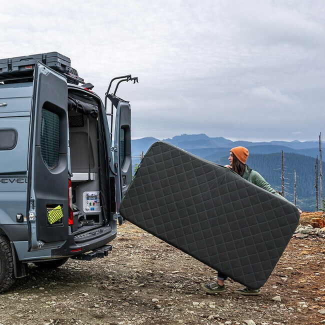 アルパインのベースキャンプ、車中泊、バンライフ、都市型ノマド生活まで、あらゆるシーンでふたり旅にも、贅沢なソロ時間にもぴったりです。最大の特長は、ウール断熱入りのオーガニックコットントリコット製トップカバー(特許出願中)。