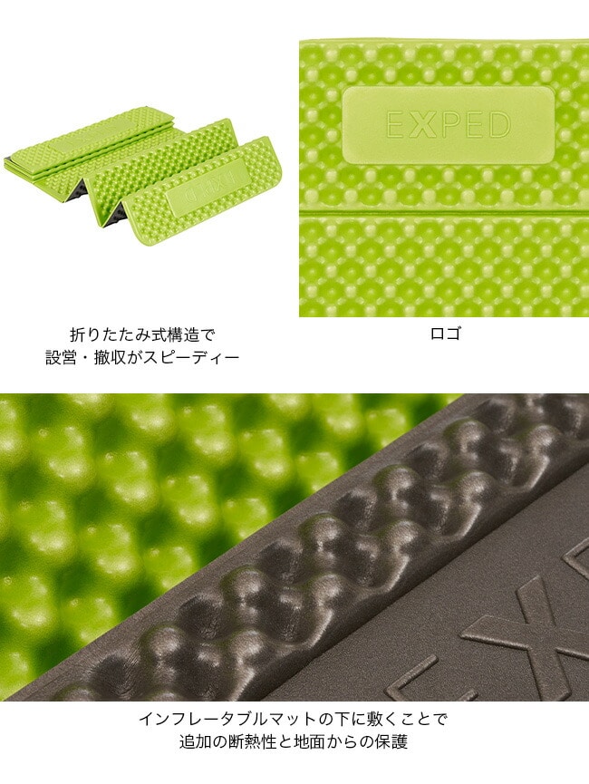 トレッキング、バイクパッキング、キャンプなど、さまざまなアウトドアシーンで活躍する頼れる一枚です。R値1.7の断熱性能により、春∼秋の3シーズンでの単体使用に適しており、またインフレータブルマットの下に敷くことで、追加の断熱性と地面からの保護を提供します。