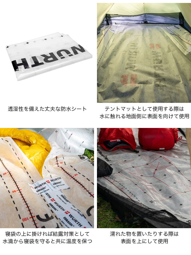 フィルム状の表面は水を通さないので、グランドシートやテントマットとして使用する際は水に触れる地面側に表面を向けて使用します。