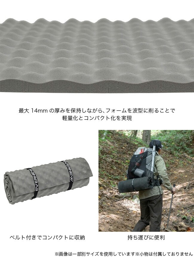 最大14mmの厚みを保持しながら、フォームを波型に削ることで軽量化とコンパクト化を実現。Trail matと同様の適度な硬さを備え、全長180cmで全身をカバーし、快適な睡眠を提供します。
