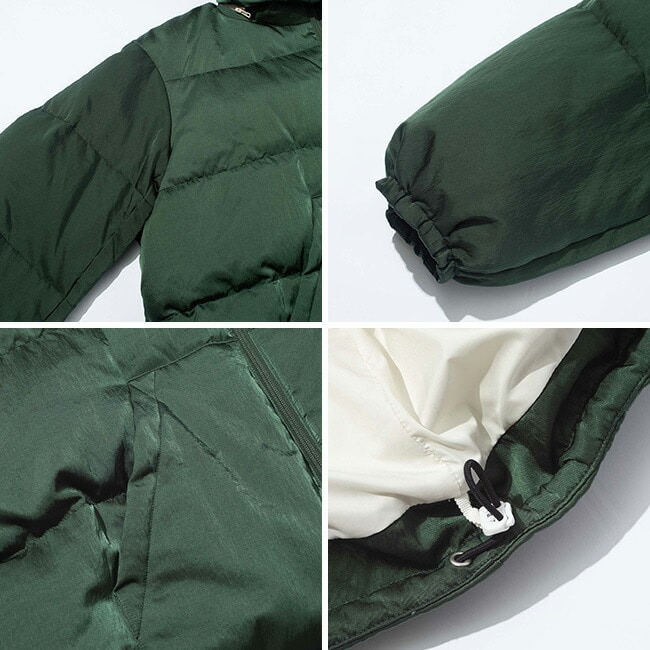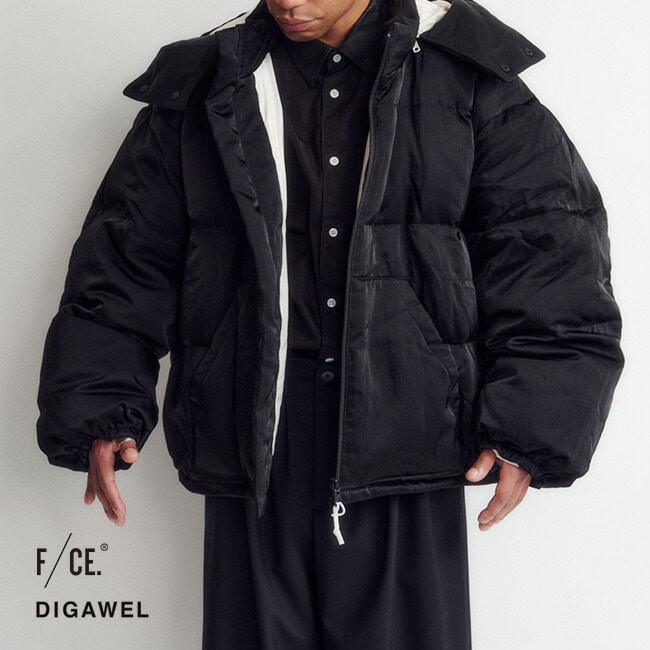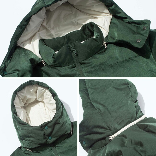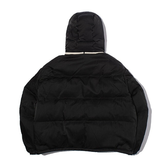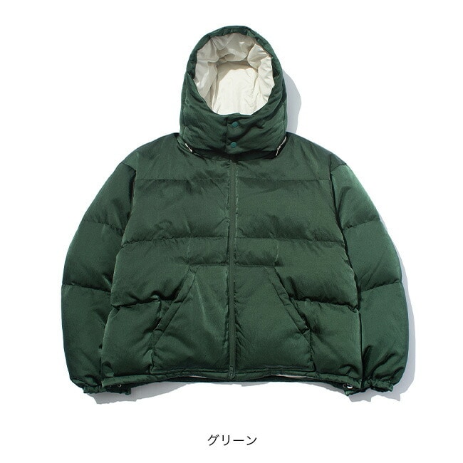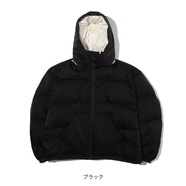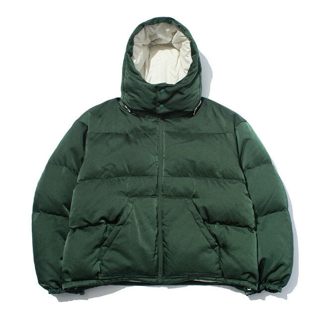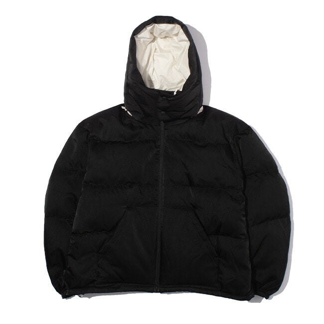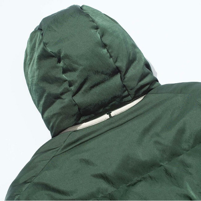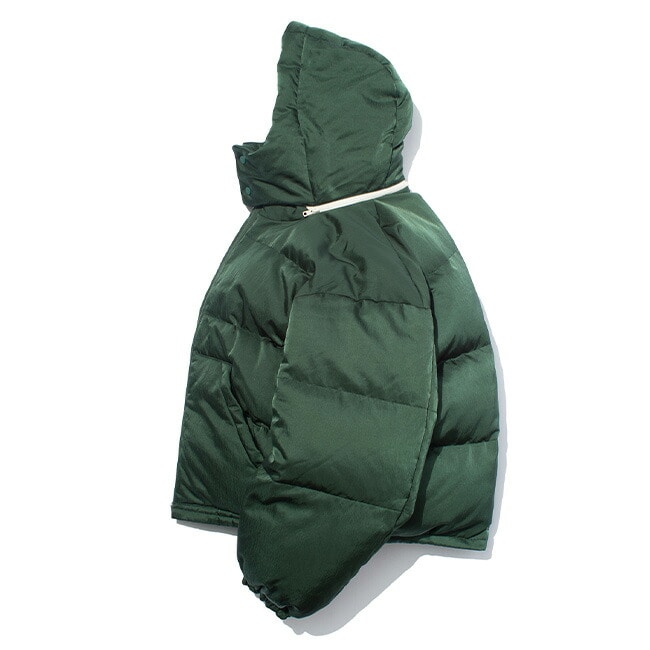 今回の協業では、毎シーズン好評のボリューム感のある型にファスナーで取り外し可能なフードを付けアップデート。ファスナー・引き手・裏地をオフ白の配色にし、開けて着る設定で作っています。