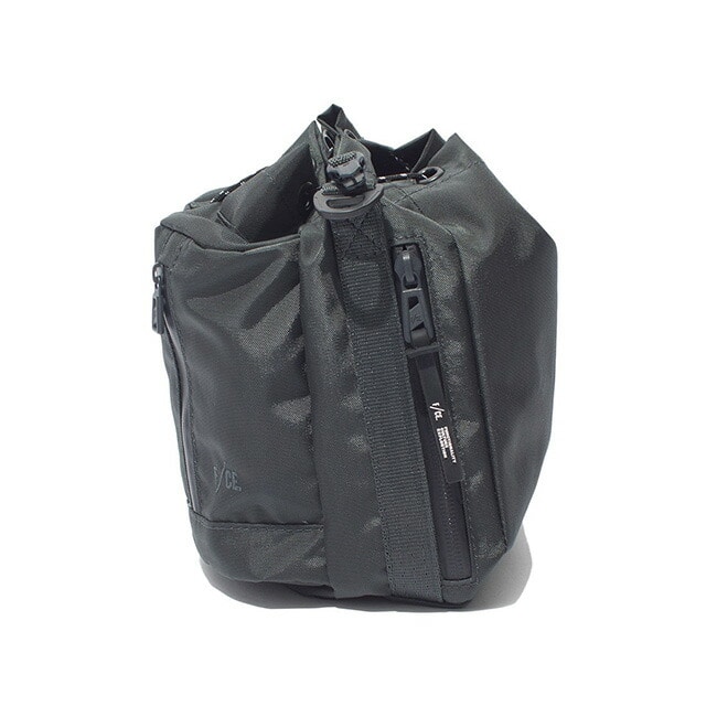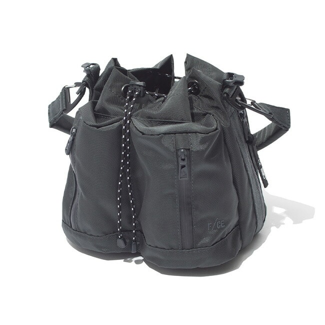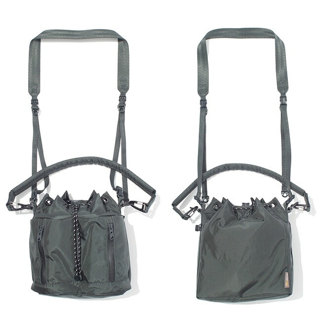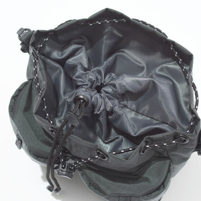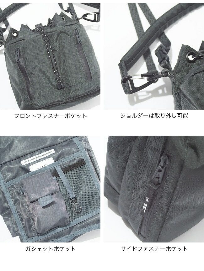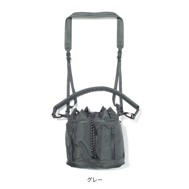 ハンドストラップと着脱可能なショルダーストラップが付属しており、2way仕様で手持ち・肩掛けどちらでも使える実用的なアイテムです。ドローコードを絞った状態でも、横ジッパーから中身へスムーズにアクセスできる設計で、日常使いに高い利便性を発揮します。