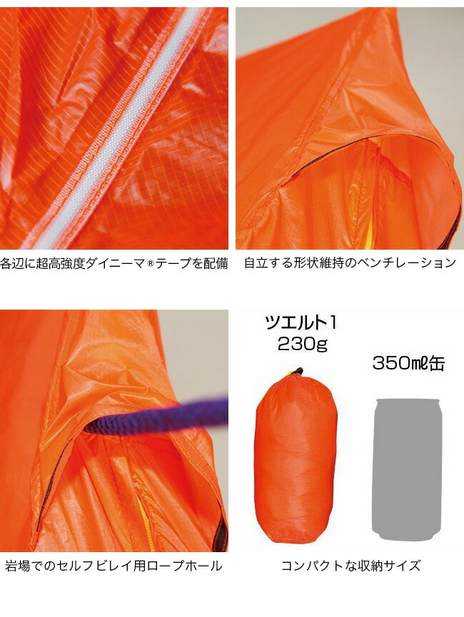 ダイニーマ®(新名称イザナス®)テープを用いたfinetrack独自のテンションスリング®システムを採用しているため、しっかりとテンションを掛けて張ることができ、広い居住空間を確保することができます。