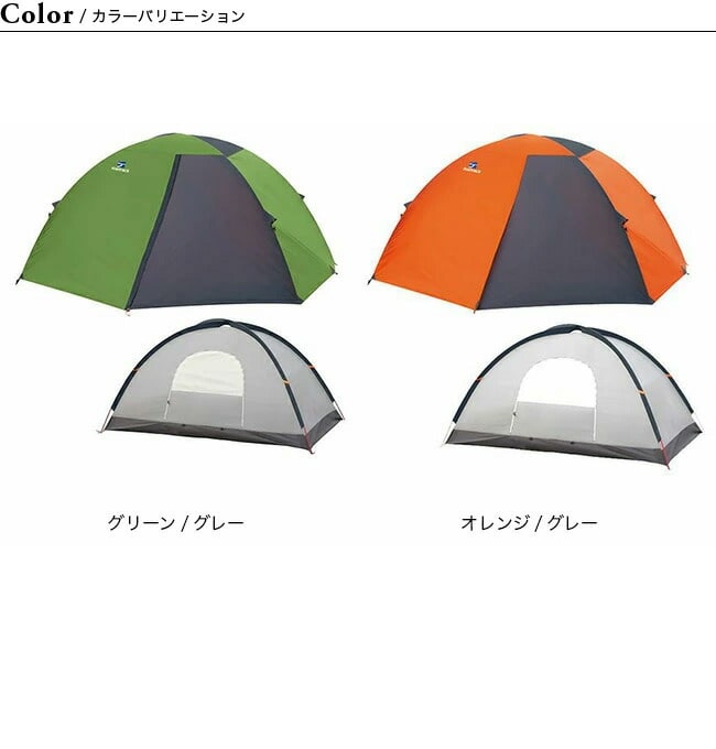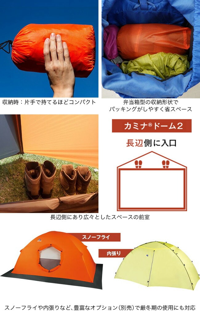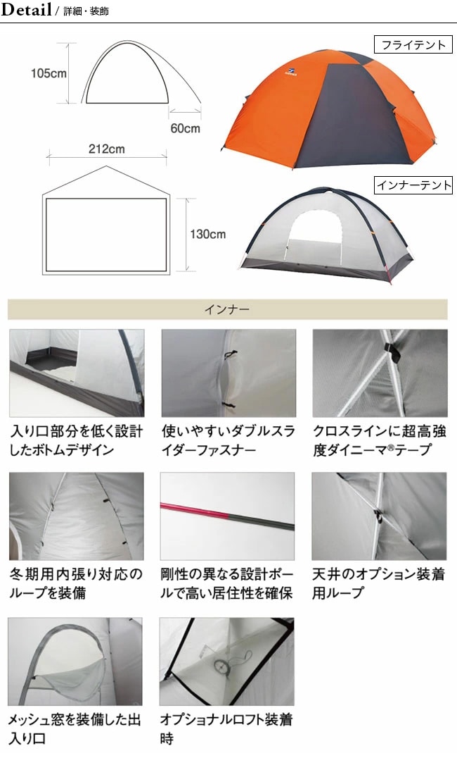 また、長辺側に入口を設けることによる広い前室の確保、前室を張ったまま出入り可能なダブルスライダーファスナーの入口、暑いときには風通しをよくすることができる入口に設けた開閉できるメッシュ窓など、快適な機能を余すことなく装備した「あきらめない」軽量テントです。