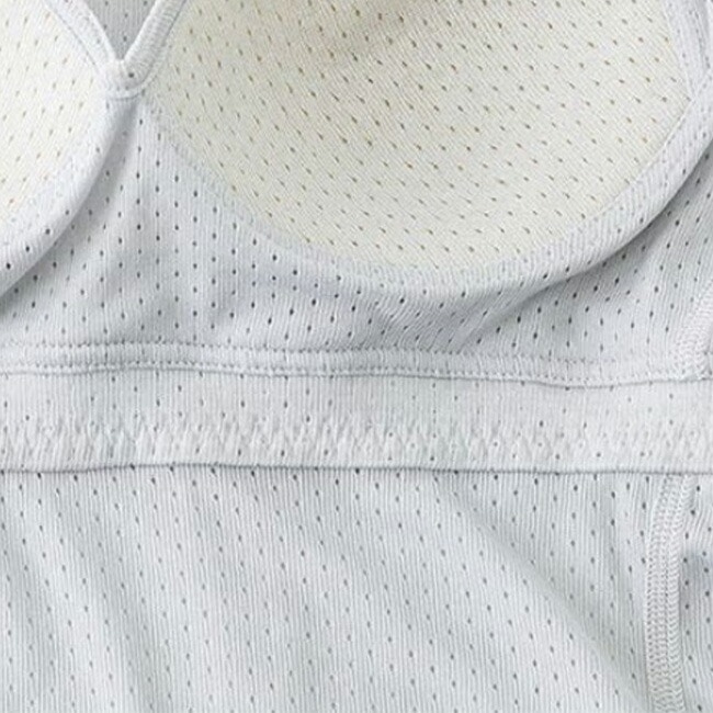 独自開発の三層構造ブラカップは、優れた汗抜けとカップ自体が保水しないため、汗をかいてもひんやりとした冷えを感じにくく、汗だまりをしやすいアンダー部分には、汗抜けのいい柔らかなメッシュゴムを採用し、汗のニオイやベタツキを抑えます。