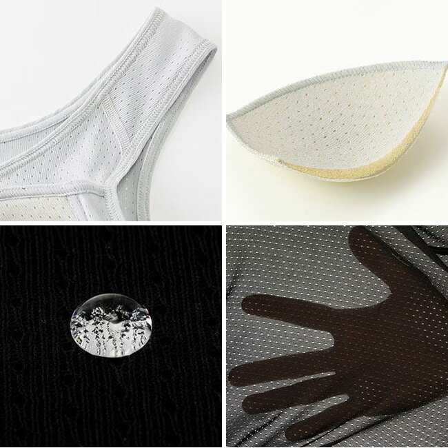 独自開発の三層構造ブラカップは、優れた汗抜けとカップ自体が保水しないため、汗をかいてもひんやりとした冷えを感じにくく、汗だまりをしやすいアンダー部分には、汗抜けのいい柔らかなメッシュゴムを採用し、汗のニオイやベタツキを抑えます。