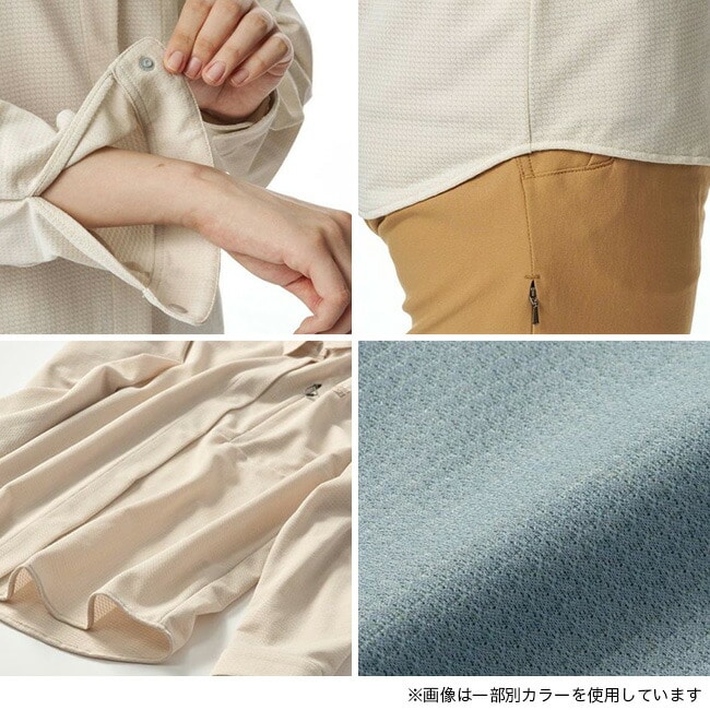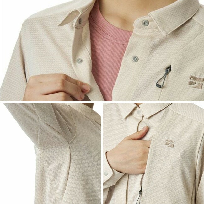 また、腕まくりしやすい袖口、片手で操作しやすい軽量スナップボタン、ファスナー付で収納力に優れたポケットなどアウトドアでの使いやすさと軽さも追求しています。