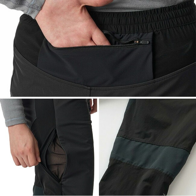 軽さに加えしっかりと防風性を持たせたい臀部や太腿の前面部分には、エバーブレス®エア生地を配置。
