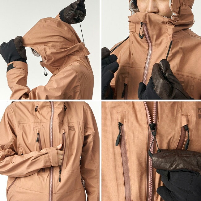 顔まわりを風雪から保護する高めの襟、寒冷地でも凍り付きにくい止水ビスロン®のフロントファスナーなど、少しステップアップした雪山にも対応可能なディテールです。