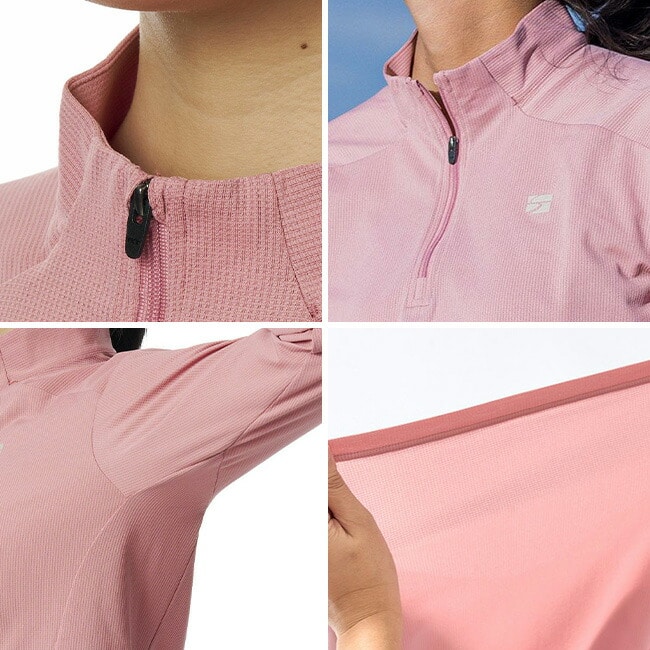 フロントジップを開放することで温度調節が可能で、襟が首元の日よけになるジップネックです。