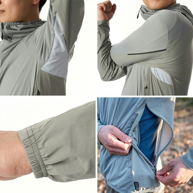 袖口や裾にはゴムシャーリングを施し、風の侵入やバタつきを軽減。