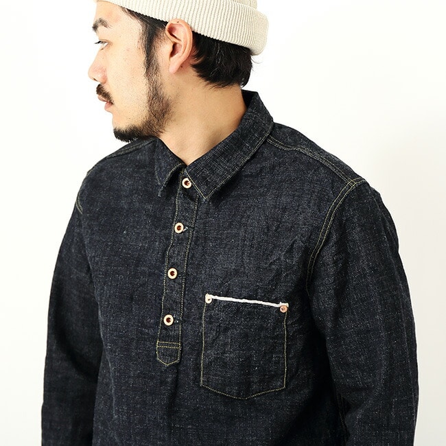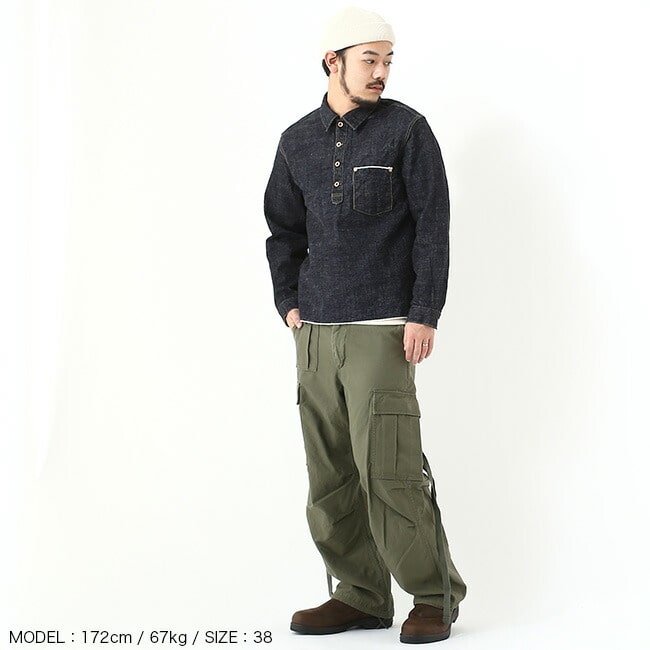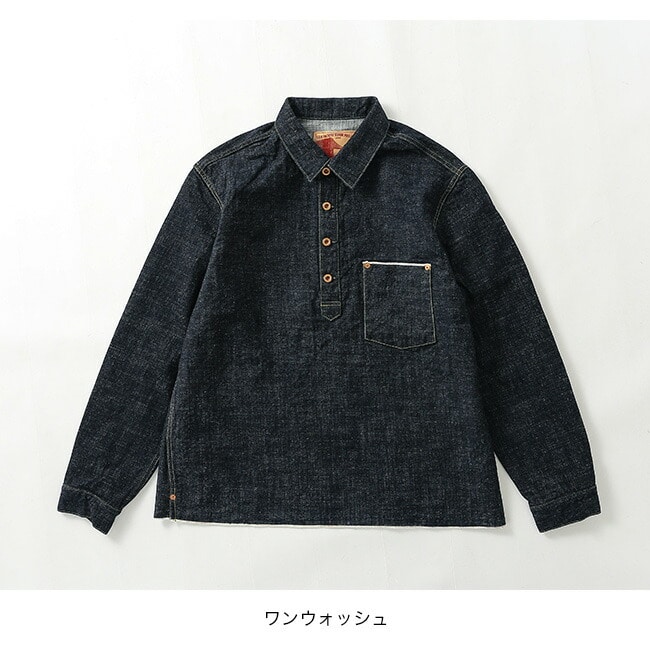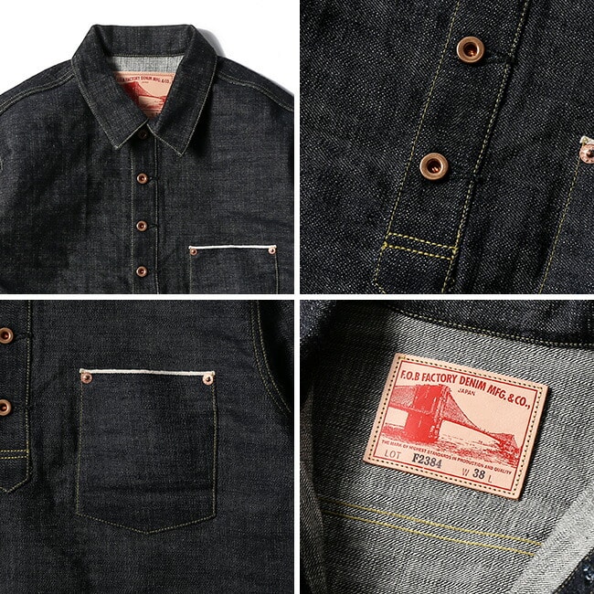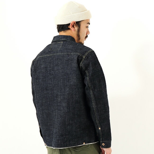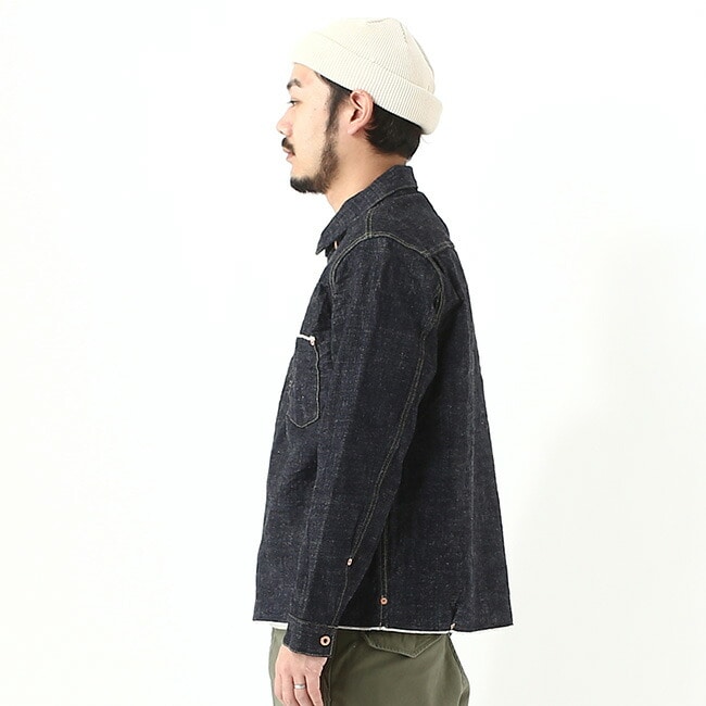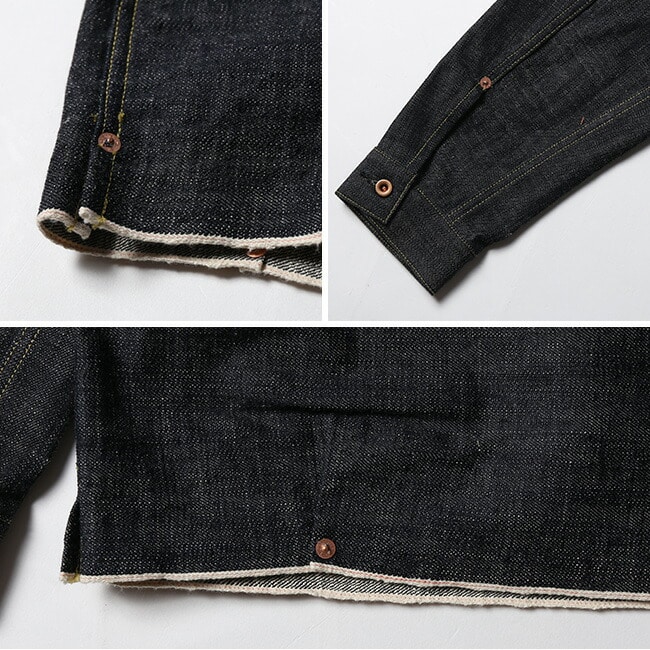 当時は、作業着として大量生産しなくてはならず、 縫製工程を極力少なくする必要があったという経緯をも再現して 銅リベットでダーツを止めたり、フロントボタンは経年変化も楽しめる真鍮ドーナッツボタンを使用しています。オリジナルで製作したG3デニムの身頃を横取りでマーキングする事で 裾にセルビッチを配す仕様になっています。